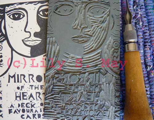 I carried this intuitive approach into the printmaking that I began in my mid twenties and into many of the different media that I’ve worked with. I’ll show you some examples from an oracle card deck I made in the 1990s. Although some planning was involved, the drawings that I turned into linocuts came about from scribbling and developing images from there. (I’ll write more about Mirrors of the Heart cards in further posts.)