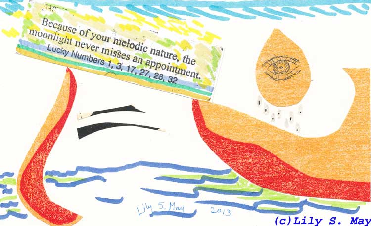 I often find that during the process of making art work, I experience physical pain from repetitive movements. Oil painting at an easel was the only pain free work that I’ve done. And so, a few weeks ago, I took a break from making booklets out of old prints and rose from sitting to standing. I then made a few small collage cards using an old colour woodcut, some linocuts, a photocopy of my favourite fortune cookie fortune and pigment markers. I’ve sent out one of the collages as mail art and will send the others out in future mailings.