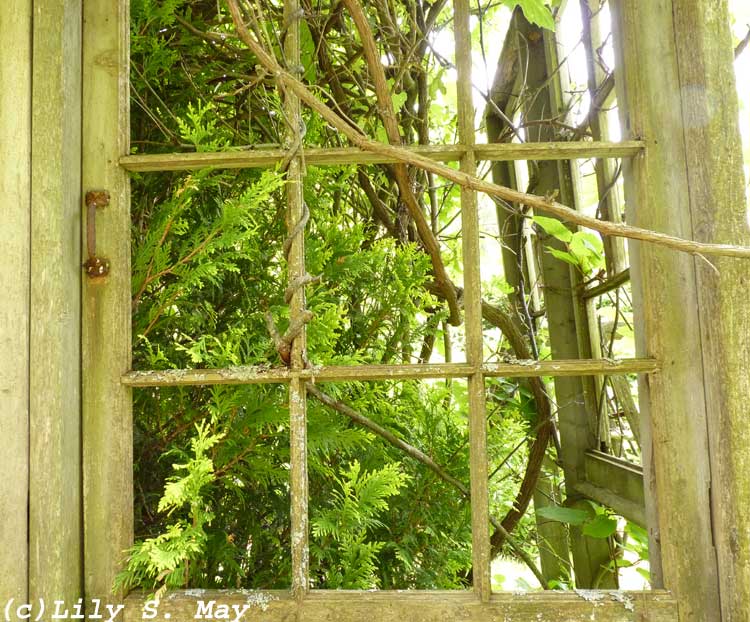 Outdoor window in Earthbound Gardens, Ontario, June 2013Who Goes There?–oil painting by Lily S. May, 2008