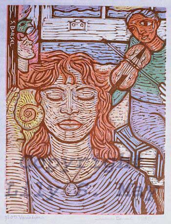 I just got back from Newfoundland where Celtic music was frequently playing. This got me thinking about a coloured linocut I made in the 1980s in response to a wonderful concert I heard at the Owen Sound Folk Festival in Ontario. One night I heard the Scottish folksinger Archie Fisher who, I believe, was accompanied by Garnet Rogers. That beautifully moving experience lead to this linocut in which I wanted to express some of what I’d felt at the concert.
