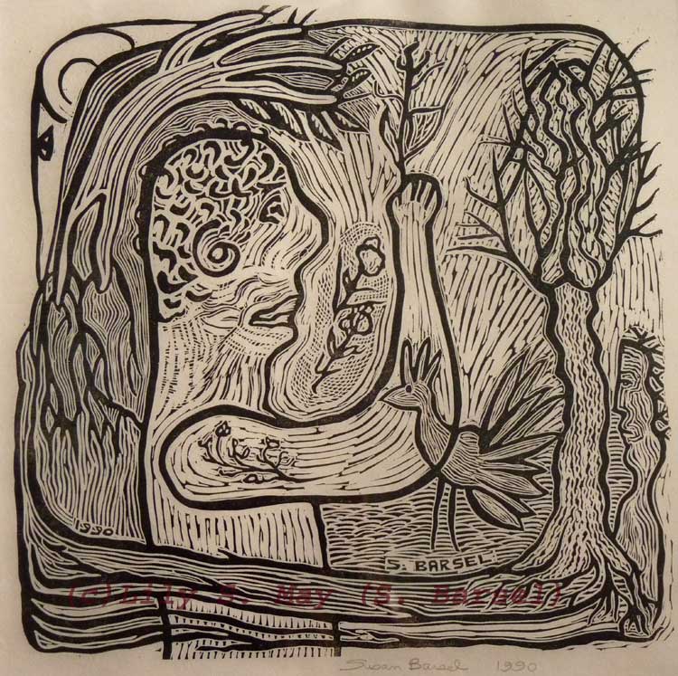 I call this print The Rose Tattoo after a dream I had near the end of 1989. (I record my dreams, finding them a source of creativity and inspiration.) In this dream, there was a man with one hand and an unusual face who had beautiful rose tattoos on his body. When I made this linocut, I didn’t try to replicate the dream in a realistic way, but used it as a jumping off place. This is what I came up with.