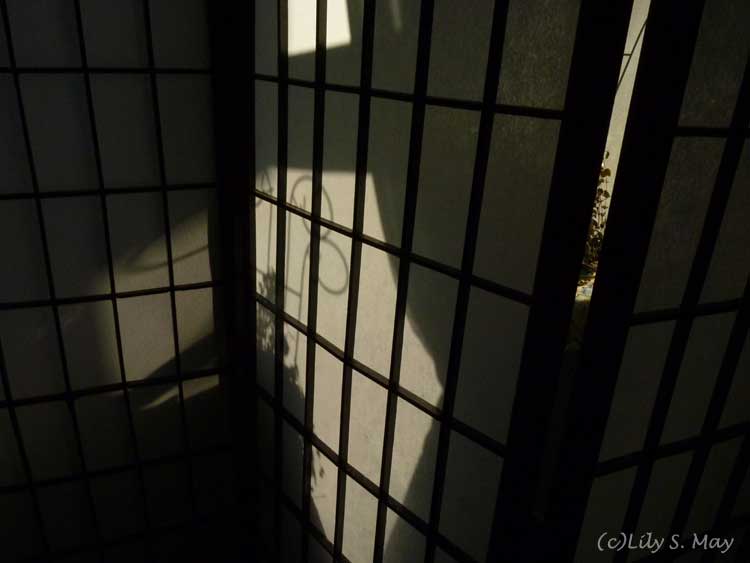 Here’s another photograph–one I took a few days ago. I loved the light through the screen, casting shadows of the plant and curtain. You can see a sliver of the plant through the space between the screen panels.