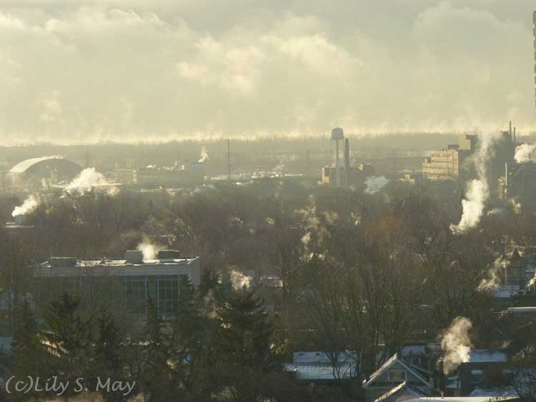 It’s quite cold in Toronto now. Yesterday, on a bright morning, I took these photographs. I was drawn to the drama of the steam and/or smoke rising from the chimneys.