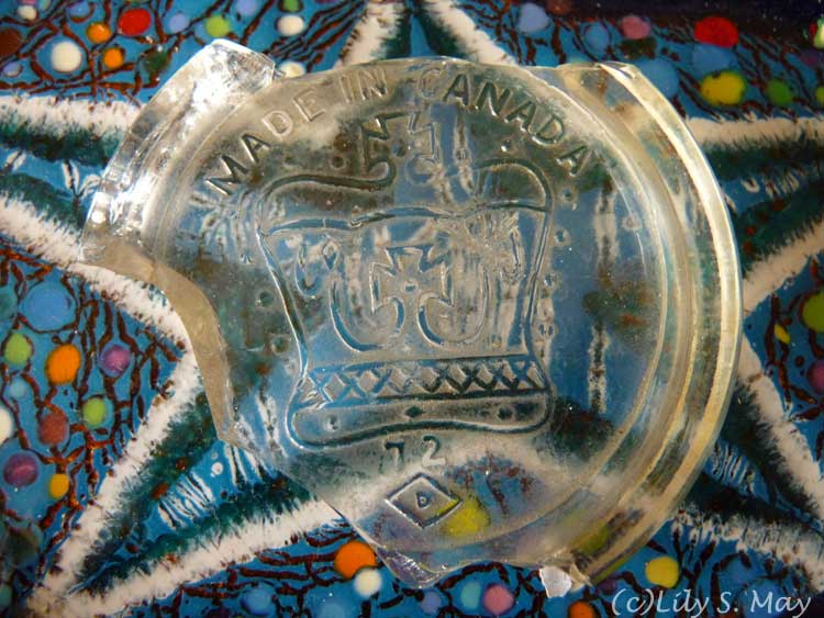 For the past few years, I’ve been drawn to the beauty in broken pieces of ceramics and glass. So last week when the lid to a mason jar fell to the floor and shattered, I retrieved the main part of it and photographed it. Here’s a photo I took when I put the broken glass on a vibrantly coloured enamel dish that’s been in my family for decades. I liked the contrast and the semi transparency, the broken and the carefully crafted.