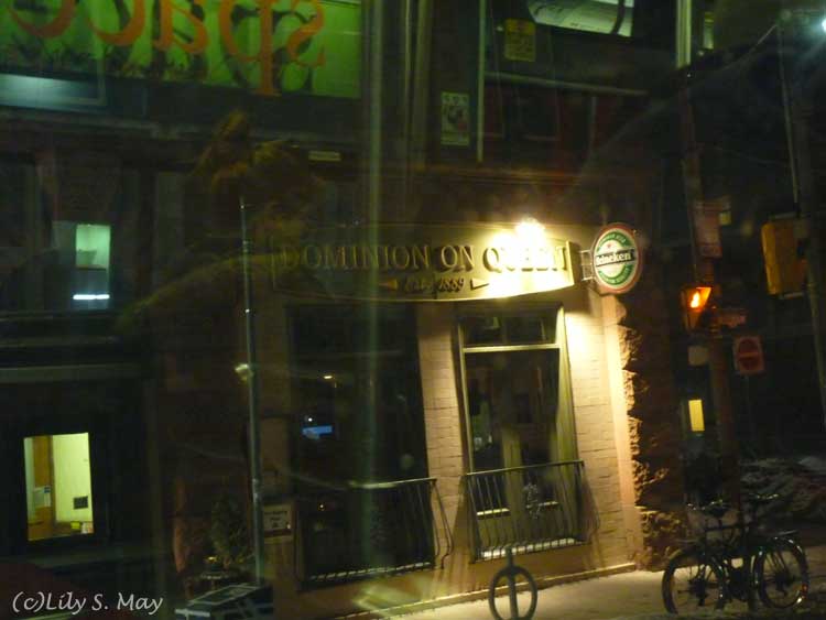 I enjoy the layered images and reflections I get when photographing out windows. One evening last week, while taking the King Streetcar eastbound in Toronto, I shot these photographs. In addition to the play of inside/outside, there’s also the slush on the window and the blurring of images from movement making some of these look almost abstract. This is a great way to spend time on a crowded streetcar and to see the familiar sights of Toronto in a new way.