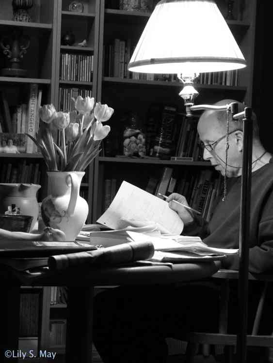 I’m settling in and returning to blogging after our computer shorted out and burned internally a few weeks ago. Now I’m learning a new system. The photo in this post is one I took in Dec. of 2012, part of the series of interior photographs I’ve been taking. I shot the image in black and white to emphasize the mood, shapes, light and dark.