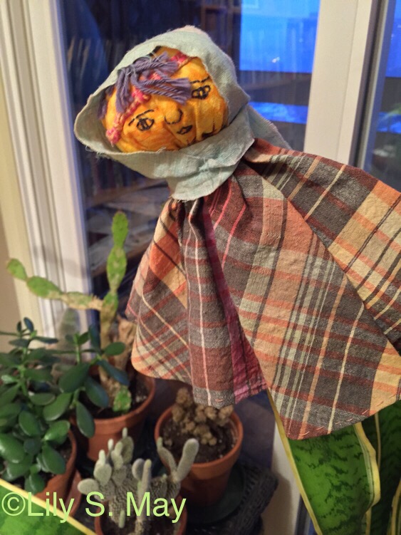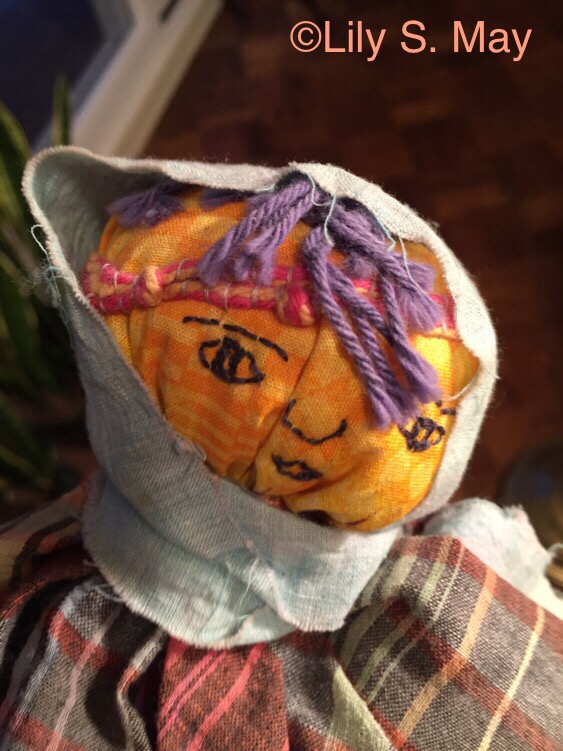 When I was making fabric quilts and appliqués in the ’90s, I became interested in old folk dolls and puppets. I made one or two simple puppets at the time. This is one of them. It’s a cross between a doll and puppet. The head, which is stuffed with batting, sits on a piece of a paper towel roll that you can put your fingers in to manipulate. I enjoyed giving the puppet a primitive homemade look with raw edged fabric and tousled yarn for hair.