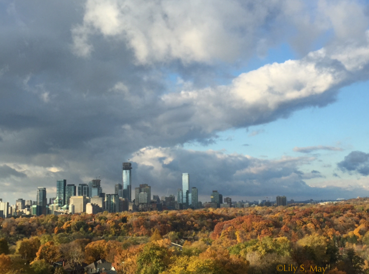 This beautiful morning, with purple clouds and orange leaved trees: Toronto 8:10 a.m, looking southwest.