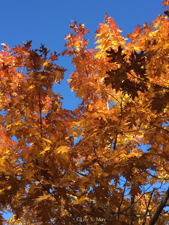 It’s been a radiant fall in Toronto and is just past the peak now. On an abnormally warm day (it’s going up to 19 degrees celsius) and before the leaves fall any further, here’s three photos from the past few weeks. The middle photo of the maple is on the University of Toronto campus–on Philosopher’s Walk. The last photo of the flaming oak against the blue sky is from Evergreen Brickworks.