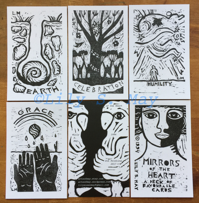 This week my auspicious card deck, Mirrors of the Heart, has returned from the printer. It’s on thicker card stock with matte lamination. This time it’s black and white like the original linos. And, I’ve added a back to each card–a linocut of two birds. I’ve put the deck up in my etsy shop.