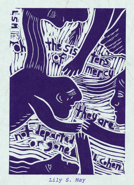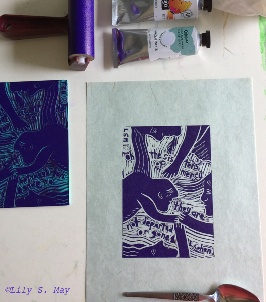 Last week, I printed the Sisters of Mercy linocut with the violet ink tinted with white. It’s on a pale blue Japanese paper with long fibres that I like. Then, on the weekend, I was out of town in Prince Edward County in Ontario. The countryside was filled with lilacs–lining the roads and lanes and in the small towns. Many were pale lavender but some were a deeper hue and even pinkish. As I admired their beauty and scent, I thought that the violet of the print had happily followed me into nature. The mercy of lilacs!