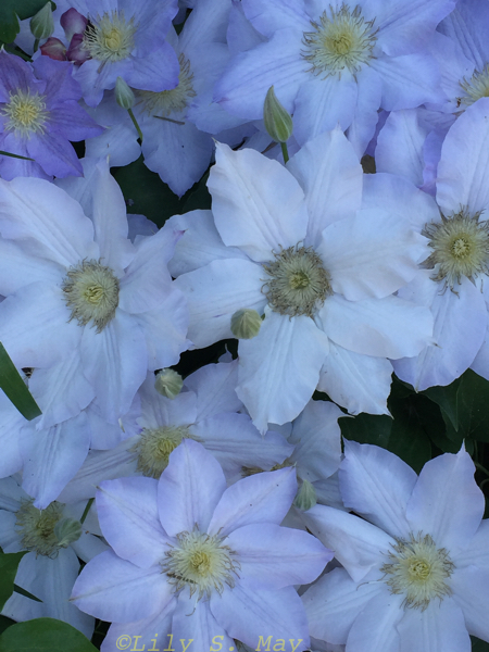 This week, while out walking under trees in my neighbourhood and admiring other people’s gardens, I came upon some tremendously beautiful clematis. This spring I’ve been restraining myself from photographing every flower I see, particularly those that I have many photos of. I’ve been doing better this year at stopping to admire scilla, crabapples, lilacs, lilies of the valley, irises without always pulling out the phone. However, there’s a limit to restraint and these flowers were it! Here’s a photo of them from midweek.