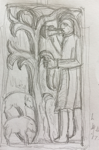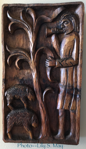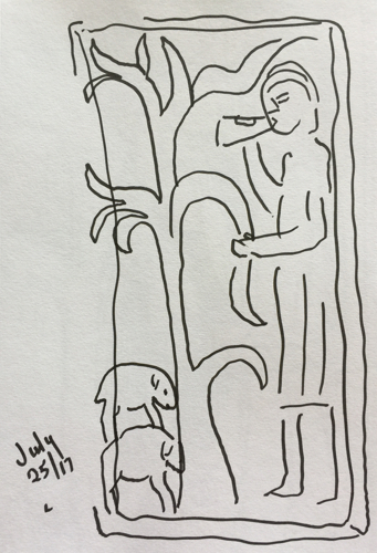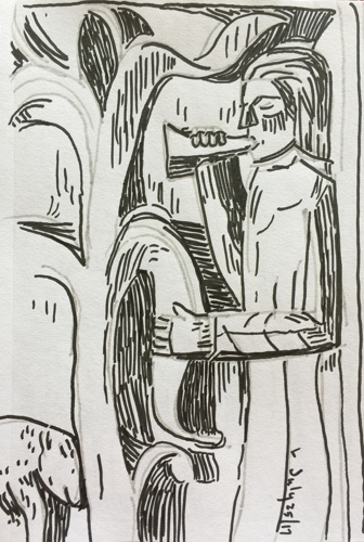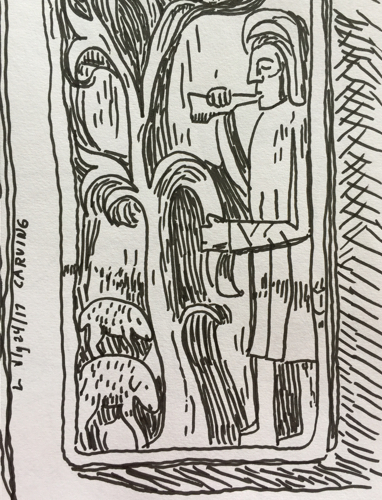 I’ve continued doing line drawings. I find the practice helps me focus–literally and figuratively. Last week, I began paying attention to a carving we’ve had for years. The plaque has been done very skillfully and with great care extending even to its back that is covered in soft chisel marks. We found it at a yard sale and loved it, buying it for only a few dollars. The carver hasn’t put their name on the work and I have no idea where the piece came from. The wood is very hard. If anyone seeing this has an idea where the carving may have been made, please let me know.