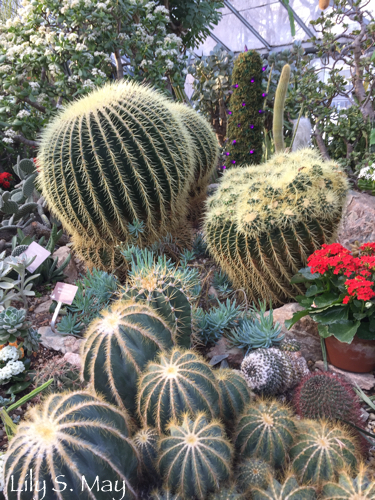 Toronto is in the southern part of Canada and though it gets cold here, it’s not as cold as other parts of the country. However, we have had a spell of pretty cold weather this week. This morning it’s -22C and with the wind it feels like -30C. It’ll be going up to a balmy -15C later. Yesterday, though, it was a more moderate -8C. On that cloudy day, I decided to lift my spirits and went off to the Allan Gardens downtown where I hadn’t been for a few years. The Gardens are in a park in greenhouses first opened in the mid 1800s. Inside are 16,000 square feet of flowers, trees, tropical plants, cacti and, yesterday, many visitors young and old. The Gardens have seasonal displays along with their year round inhabitants. I snapped many photos and you’ll see the Christmas displays among the plants. What a great respite from the cold and grey.