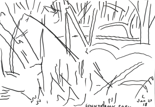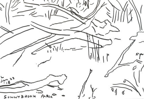 The textile show opening that I mentioned in my last post was enjoyable. Since then I’ve continued painting and I’ll post some of that work in the future. I also continue line drawing. This past weekend, the weather was a lot milder and we went for a walk in a park that is part of one of Toronto’s ravines. On our walk, we came to an open area with stumps of trees, branches on the ground and dry grasses that I loved for their different shapes and placement of all their forms. I took several photos and today made some simple line drawings loosely based on those photos.