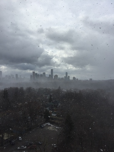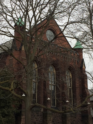 Here’s two photos from a mostly grey, flurrying day in Toronto last Friday, March 9th. The clouds and mist over the ravines always draw my attention with their endless beautiful variations. And I loved the look of this church I passed–the deep red and brown brick, the trees’ branches above. These scenes from the city–they continue to sustain me.