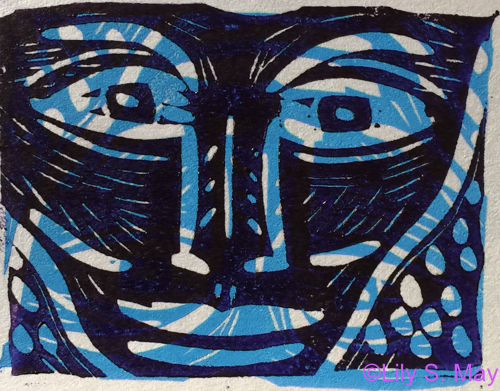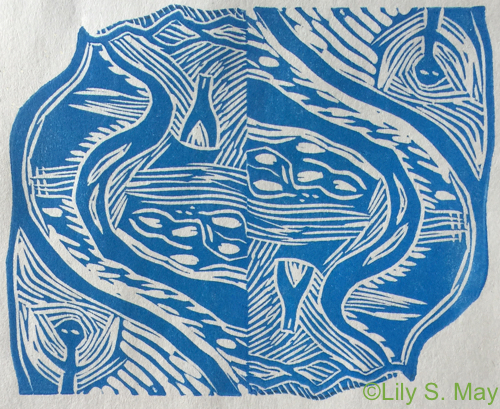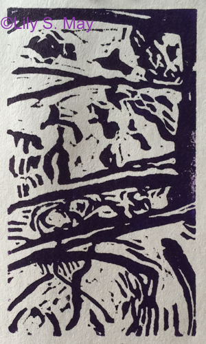 First, The Proofs: I’ve continued working on rough proofs, trial block prints, that I’ll be submitting to BIMPE–Biennial International Miniature Print Exhibition. I’ve gotten them to the point where I’m ready to print them in their final form. Here’s the three of them. I think of the first as a dreamscape, the second as a view across fields and the third as a skull or a view behind a mask.