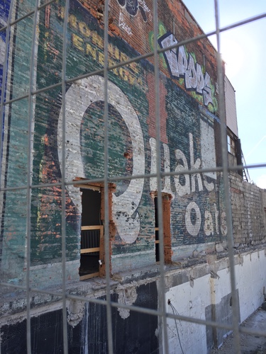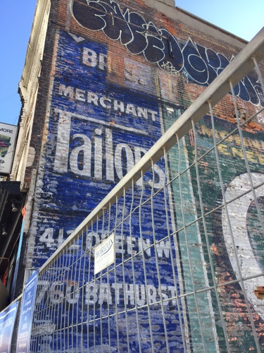 Second, The Past: While at Bathurst and Bloor Streets this past weekend, I took the following photographs. The southwest corner of this intersection in Toronto was known for decades as the home of a large discount store called Honest Ed’s. It had a famous sign that has been preserved, but the building has recently been demolished. Seeing an open space where it used to be was shocking enough. But, seeing the old advertising signs that had been hidden, that were painted on the adjacent wall was another surprise. And, before this wall of old ads and new graffiti is erased in the city’s high rise construction frenzy, I took some photos as a remembrance.