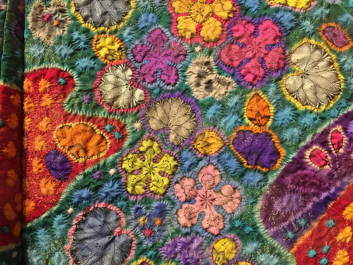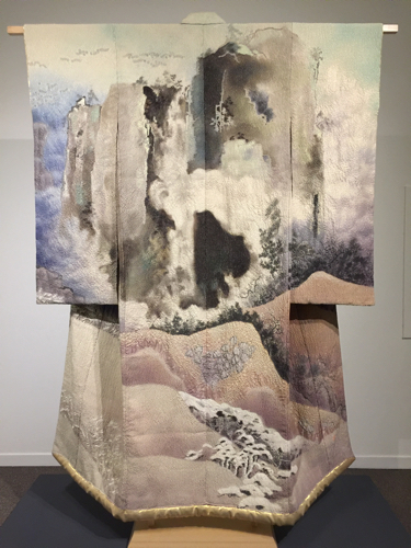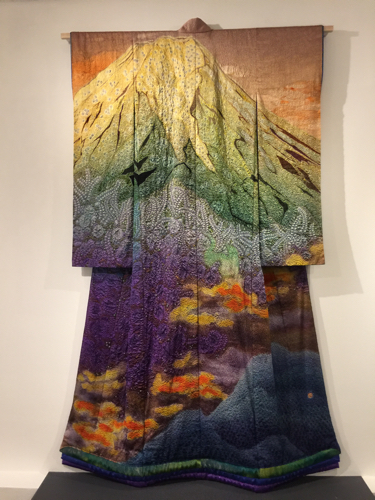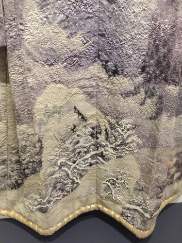 Some of the most beautiful works of art I’ve ever seen are now on display at the Textile Museum of Canada in Toronto. Itchiku Kubota created the 41 kimonos in this show between 1976 and 2003, when he died at the age of 86. If you live in or near Toronto, this show is on until May 13th. The kimonos combine many elements–embroidery, ink drawing, resist and tie dying–to create the scenes that often travel across several kimonos, creating panoramas of nature and the cosmos. The kimonos are of different seasons and parts of the universe–so some are very brightly coloured and others, more muted. Here’s some photos I took at this excellent exhibit.