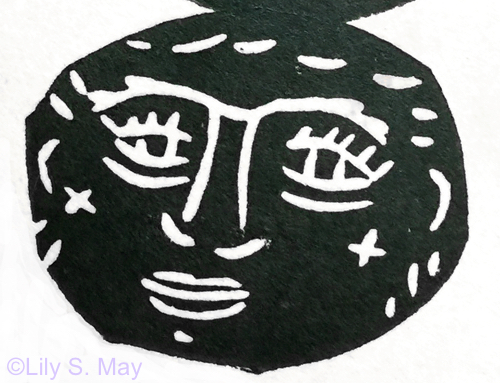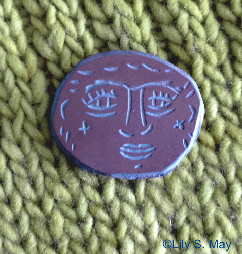 It’s a beastly day here in Toronto–the whole weekend we’ve had freezing rain and ice pellets. Wind and rain are due tonight. To the rescue comes a little linocut I made in the ’80s or ’90s. I unearthed this forgotten piece just before working on the prints I’m going to enter into the miniature print show, BIMPE. It’s a simple little face that has a bit of a mysterious feel to me. I printed it on newsprint paper as a reminder of it. Here’s a detail of the repeated pattern I printed and the lino itself. I don’t recall if I ever printed the little face when I made it. If I did it would have been part of a larger design. I’m going to print a few impressions on good paper and give it the attention I think it’s due.