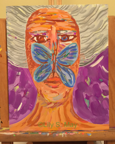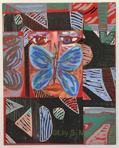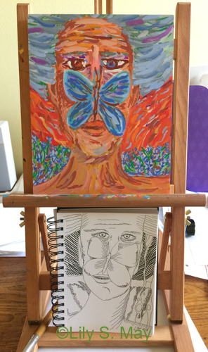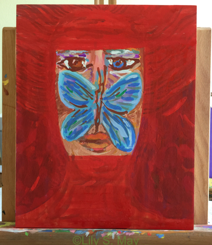 A few weeks ago, I began an acryl gouache painting from a line drawing I had made. The painting went through several stages but never felt skillful enough to me. Finally I decided to paint over most of the image in red and to paste parts of an old woodcut over the painting. Afterwards, I added more paint, mostly to the pieces of the woodcut. Below are some of the stages the work went through. I enjoyed the process and am now working on another piece. I am trying to draw together parts of my life with this process–the young artist and the elder.