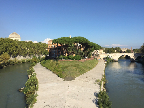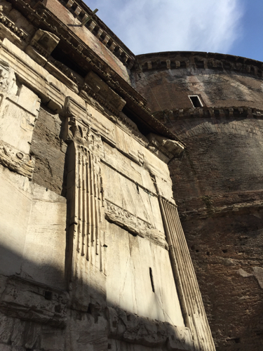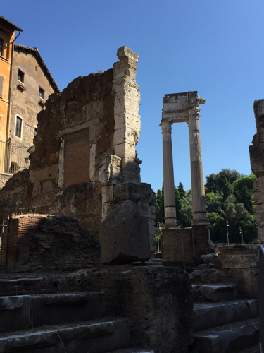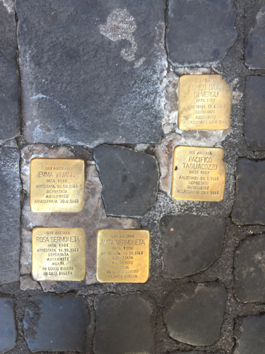 There are a great many churches in  Rome and we viewed all of them from the vantage point of outsiders because we are Jewish. And so one day we also went to the area that had been a Jewish ghetto. There we saw the outside of a large synagogue and Jewish restaurants near golden cobblestones memorializing people who had been deported to Auschwitz in World War II. By the former ghetto there were also the remains of a theatre and temples from earlier times and to other gods.