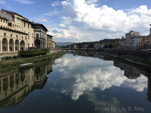 Here’s one of my favourite photos from my trip to Italy and certainly of my time in Florence. The Ponte Vecchio means the Old Bridge and it is lined with shops selling gold jewellery. But there is a spot on each side of the bridge that is open to the river Arno. There, in mid September, we stood looking out at a scene so beautiful to us that it still returns to me here in Toronto. It was one of those days I was glad to be alive.