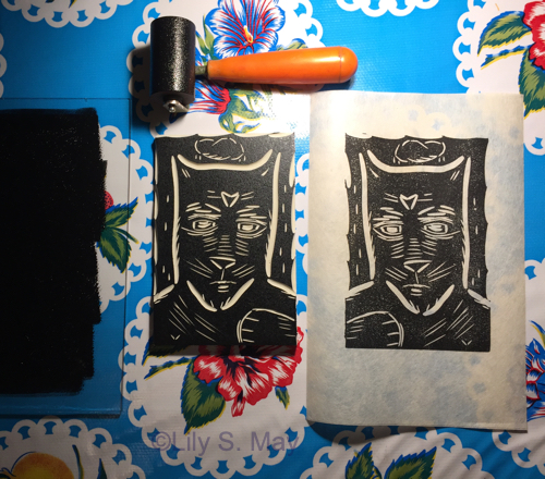 Here’s the block and print laid out on wild Mexican oilcloth that covers my work table:
