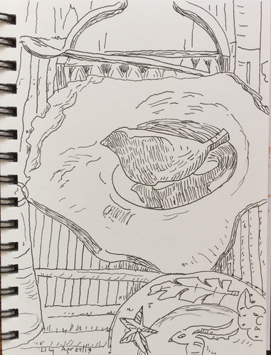 I’ve been carving another block print. And yesterday I thought it would be good to also get back into drawing again. I haven’t done this in a while. It’s a way for me to be connected to seeing and paying attention even when not involved in a larger project. So today after breakfast I drew the familiar objects in front of me.