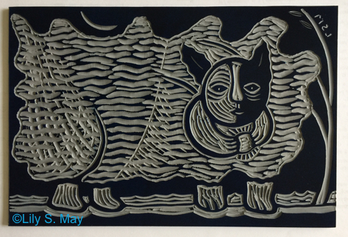 I owe the completion of the block to my husband who asked why I didn’t send it to the print exchange I was thinking of entering. (I have since abandoned that plan and am focusing on other prints.) The folded part of Mercy for the Children which you can see in the Amended Lino post was too large for the exchange. That prompted me to take out the original block. I was in a relaxed mood and decided to carve the body further without any carefully worked out plan. This could have turned out to be foolhardy, but, thankfully, the adjustments added more energy to the print. Here’s the inked lino block and the print.
