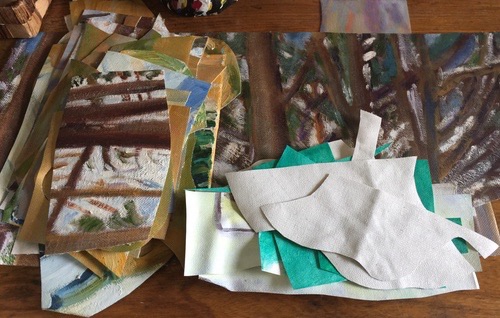 I’ve made some carved adjustments to the Wake Up print but haven’t yet printed the results. What I have been doing is dismantling and cutting up old paintings that I’ve felt are not my best. I’m working, slowly, to whittle down my stuff–whether works I’ve made or things I’ve bought. As part of that I’ve decided to be bold and take apart some canvases. This has felt daring at times because I feel that I’m breaking a taboo. I now have a pile of large and small pieces of old paintings. What I’ll do with them is still percolating within me.