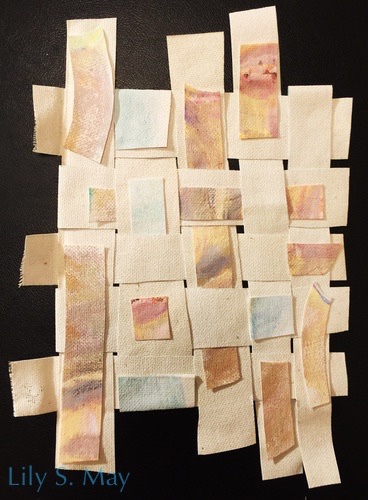 One of the most detailed processes was dismantling an old self portrait on a canvas board–peeling the canvas off, sponging the back to remove bits of the paper board still stuck to it and then recycling the board. Once I’d done that and cut the image into pieces, I played around with the strips and wove some of them together.