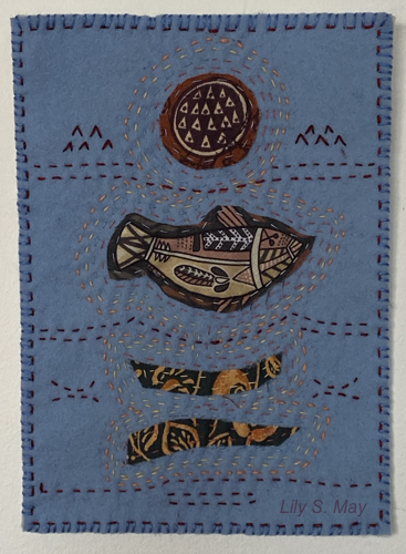 Though the readings by an actor taking on all the voices are not in any way boring, I am lulled to sleep as I listen, much like a child. So, I’ve taken to doing something while I sit and listen to keep me awake. I’ve mostly done drawings, both of items in the room or designs in my head. But recently I also made this small (around 5” X 7”) appliqué out of wool felt and printed cotton fabrics. Sewing can be very calming in itself and the balanced look of this piece was also calming to do. A small needle and thread doodle!