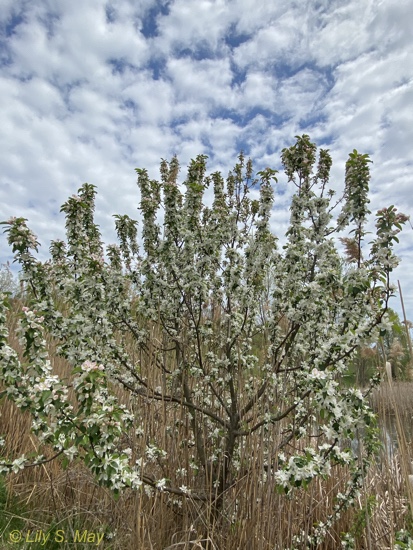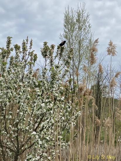 I am working on another felt appliqué. In the meantime, here’s two photos I took in May at Evergreen Brickworks. I loved that the clouds and blossoms mirrored each other that day and that the red-winged blackbird stopped long enough to be in the first photo.