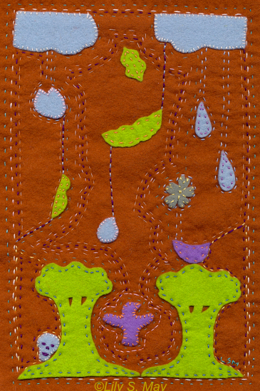 I began working on this wool felt appliqué in the spring and finally finished it (for now anyway) during this past month. At first, when I assembled the shapes, the piece looked like a scene of innocence. That didn’t feel right to me because this time has not been innocent what with the arrival of the pandemic. Soon I knew what to add: the little skull in the lower left corner. The stitching then took me a while to design. I spent long periods looking at the piece before seeing what I felt needed to happen and then sewing it.