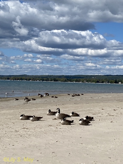 Presqu’ile is on Lake Ontario near the town of Brighton. We had been there before briefly and I was fortunate to have the chance to walk on that long beach for some sense of peace in the midst of the turmoil of covid-19 and social injustice. Here’s some photos I took with my phone on that beautiful cool day. There’s Canada geese, sand, water and clouds, hardy plants and flowers, driftwood and the path through tall reeds and trees to a shorebird viewing area.