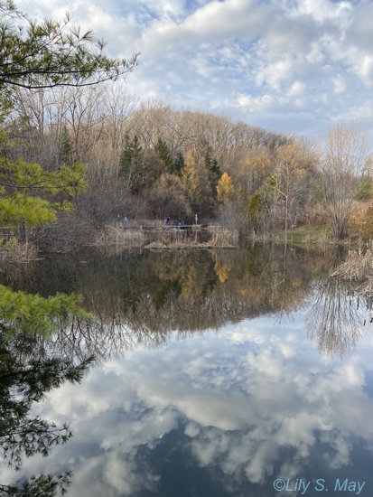 At the Brickworks, I took out my phone to photograph a scene that I found beautiful. My attention was focused on the yellow leaves and their reflection in the pond. So I was surprised by what the camera had recorded. Yes, there is the reflection of yellow leaves, but I found the predominant elements to be the symmetry of the hill reflected in the water along with the texture of the cloud dappled sky.