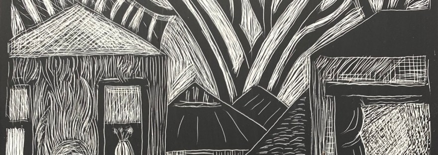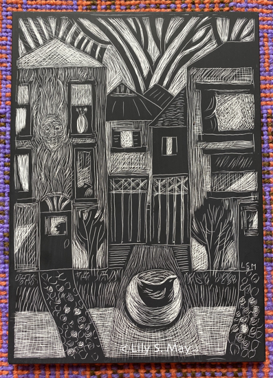 During the pandemic, I’ve been out walking on streets of houses surrounding the neighbourhood that I live in. I always take solace from the trees and gardens I see. But I’ve been surprised at how the look of some of the houses improves my sense of well-being. In particular, I often love looking at the space between houses to see the backs of houses and trees on more distant streets. This is new to me and I sometimes feel that I’ve been transported back to scenes that I found beautiful in childhood but cannot now fully recall. Other than that, I have not found words to describe the feelings. Thankfully, there is also drawing as a way to express things beyond words. The scene in this scratchboard drawing arises from these feelings.
