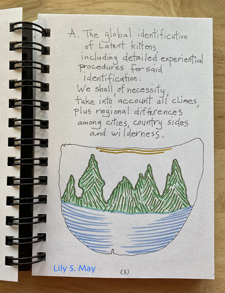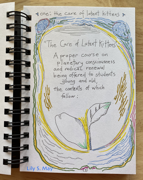 I decided to write as spontaneously as I could to see what the course might be about. I also decided that latent kittens would be an actual living, known animal that didn’t need an explanation, much as, say, an elephant or whale would be known. And they would not be young cats.