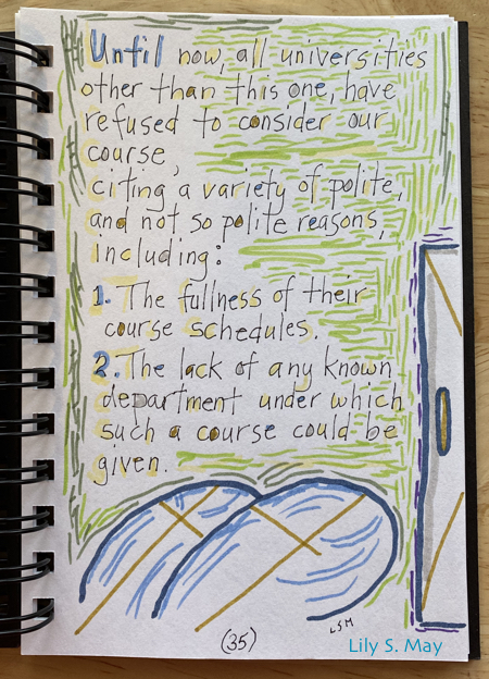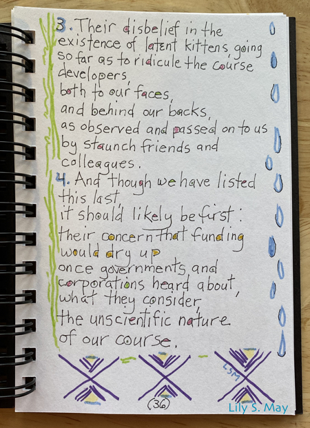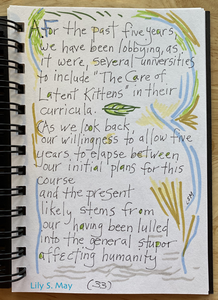 The Care of Latent Kittens story arose from a dream I had years ago. That story continues here, nearing the end of the sketchbook of writing and line drawings. To read about the dream and what led to this series, go to The Care of Latent Kittens. If you’ve missed any posts, you can see them in the posts following that initial one.