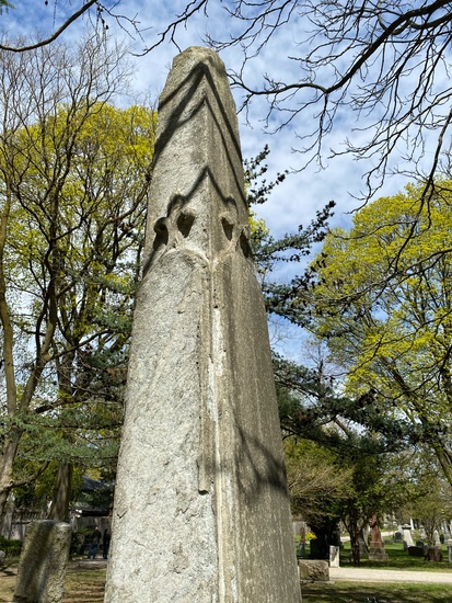 As I continued walking around, I became interested in seeing if religious symbols, other than Christian ones, were present. I did come across two or three plaques with symbols of Judaism. Being a Jew myself, I had wondered if any Jews had been buried at the necropolis. I also saw graves with Asian names on them, but was unable to understand the writing and whether it was of a religious nature. There were also stones without religious symbols at all.
