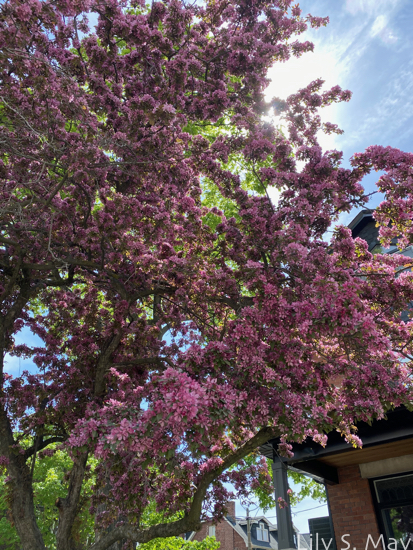 red bud trees and one last pink crabapple tree that has not yet lost its blossoms,