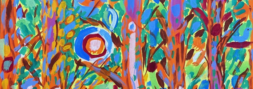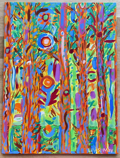 My most recent work is a departure from the scratchboard work I’ve been doing. I’ve been thinking of painting for several months and finally turned thoughts into action. I was fortunate to have supplies in good condition that I bought a few years ago–two gesso boards and tubes of paint. So, off I went into the land of bright colour. I had great fun painting and plan to continue.