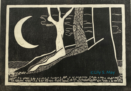I was looking through some of my early prints the other week. Here’s a linocut that I made in 1974. I was playfully inspired by the kapok trees I saw in the Caribbean when I visited my family there. I loved those trees, in particular a huge one whose buttress roots formed a sort of cave you could walk into. Here, the kapoks are resting, sleeping in the arms of other kapoks.