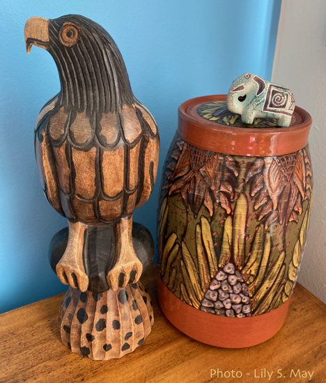 I’ve been drawing some objects in our apartment that I love. These include a wooden hawk that we once bought at a lawn sale in our neighbourhood, a ceramic cookie jar that we bought decades ago at a large art fair in Toronto and a little stone elephant that I can’t recall how we acquired. I don’t know the name of the artists who made the objects. I believe I can make out the name Cumberland or something like that on the bottom of the jar, but that’s all.