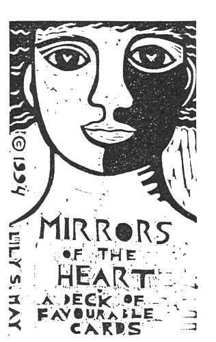 Here’s the linocut I vaguely recalled. It’s of a possible title card for the Mirrors of the Heart deck I made in 1994. I considered several names for the deck and The Good Deal was one of them that I eventually decided against. But I like the linocut which is similar to the one I ended up using.