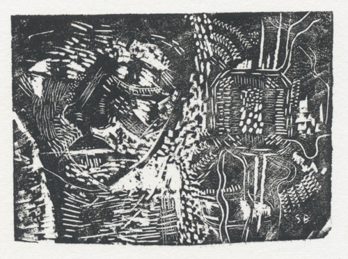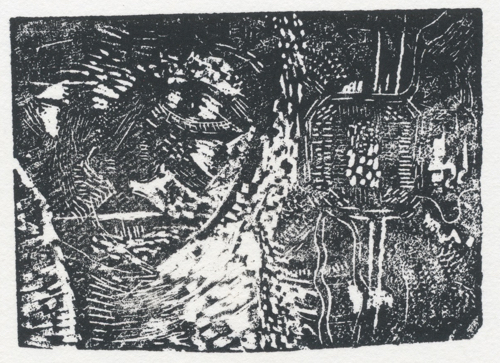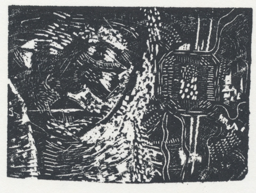 I’ve also begun a sketchbook exchange with a friend that I’ll show here as the project progresses. Prior to this, I went searching through my early prints to see if I’d done any prints on paper of the Shield lino block that I posted. I didn’t find any, but came across a linocut I recalled and some experimental wood engravings that I’d forgotten about.