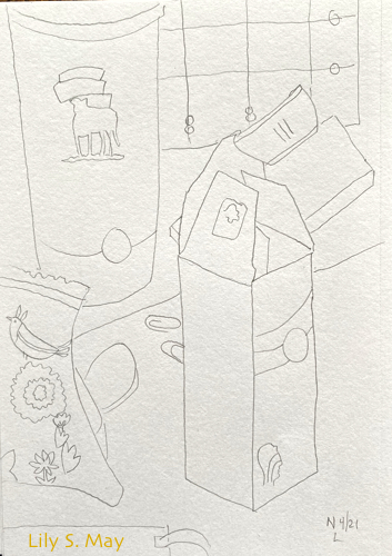 Since completing the Household Jungle painting/drawing that I showed last time, I’ve been contemplating next moves. Often the creative process involves lots of mulling over in a sort of incubation period. I’ve continued with line drawings in my sketchbook, simply to feel a connection to that part of my life. Here’s one of objects sitting on my work table: