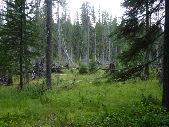 In 2013 I wrote a poem that I’ve made a few changes to this year. Among the additions, I’ve changed the reference to passing years to bring it up to date. The setting for the poem that I see in my mind’s eye is a place my husband and I visited in Cypress Hills Park in Saskatchewan in 2011. Here’s a photo I took of the scene. And following the poem is a work in progress relating to it–a collage I’m making from parts of old wood and linoleum cuts. I’ll post the finished piece later on.