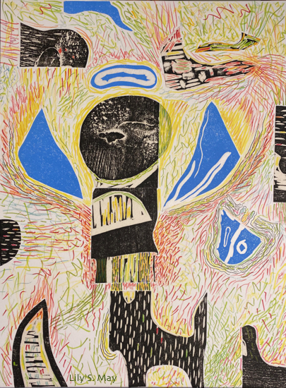This week I completed the Day of the Angel mixed media piece that I showed in its initial stage in my previous post. I began it as a collage of early wood and linocuts. Over the week I added drawing with pigment markers and water soluble pencils.